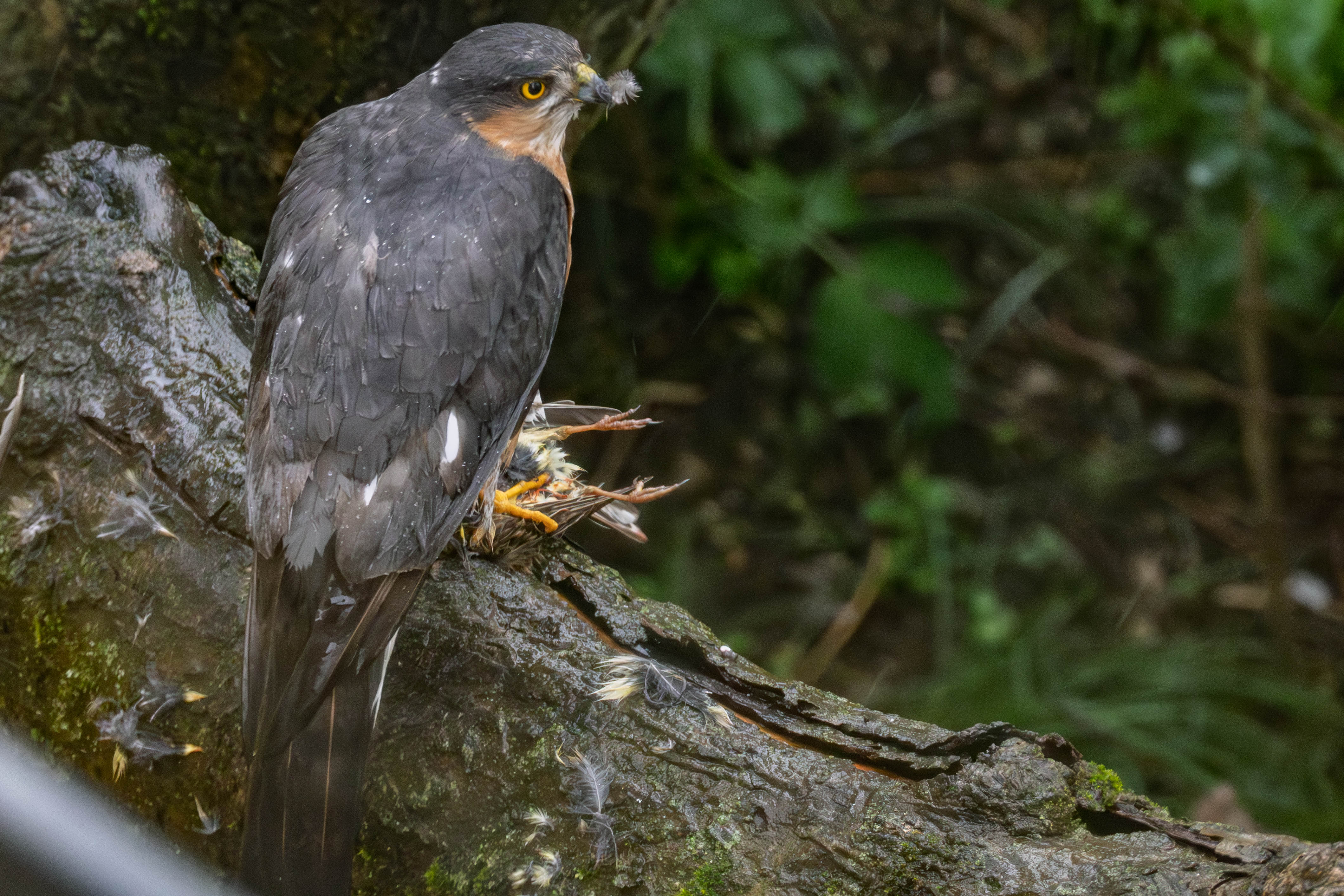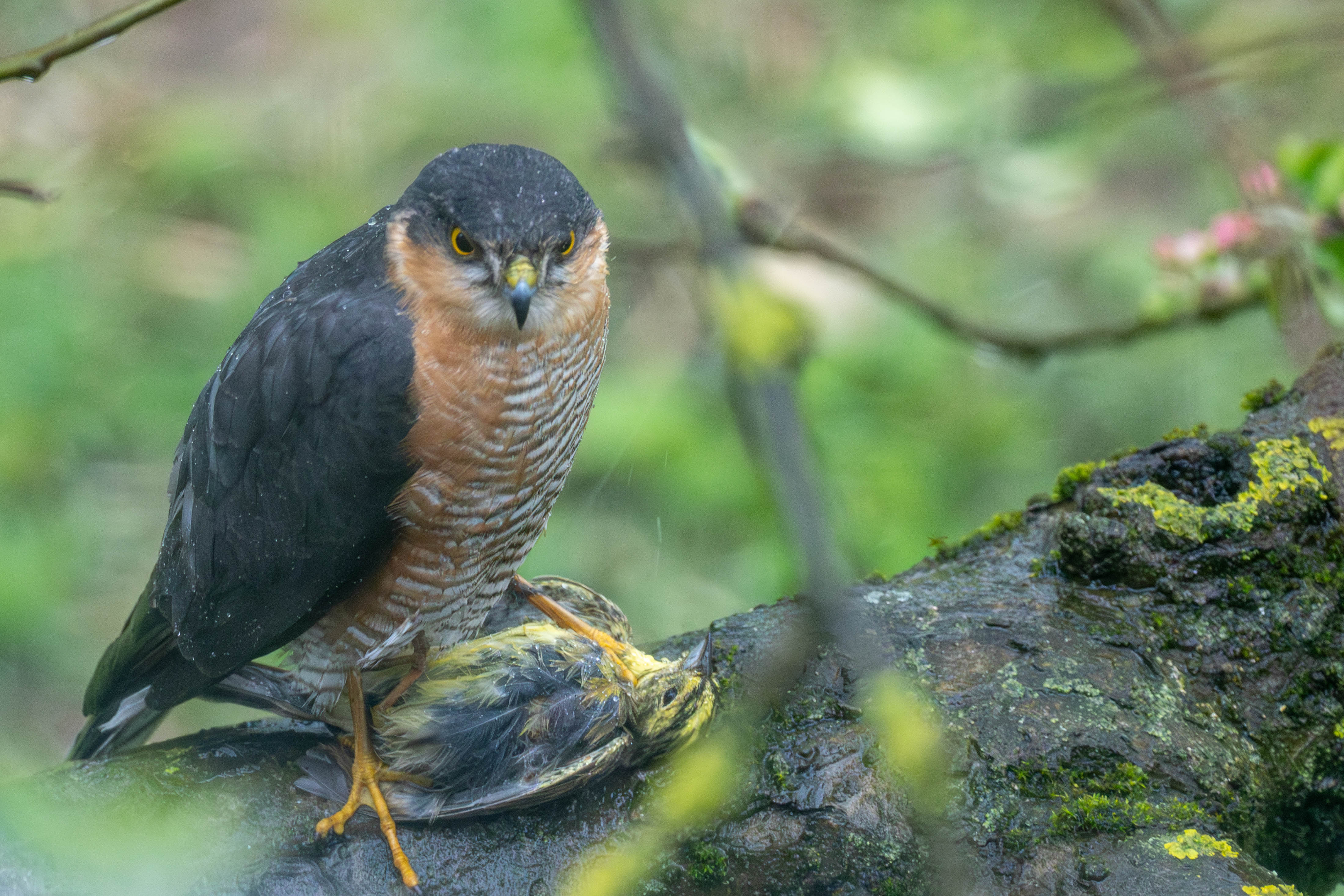 Ein adultes Sperber-Männchen (Accipiter nisus) war heute Vormittag während eines Regengusses auf einem alten Apfelbaum zu beobachten. Das Tier hatte einen Girlitz geschlagen und vor Ort gerupft und zum Teil verzehrt. Da eine ganzjährige Fütterung erfolgt, kommt der Überraschungsjäger des Öfteren vorbei. Er ernährt sich zu 90 % von kleinen bis mittelgroßen Singvögeln. Das Weibchen hingegen schlägt Vögel bis zur Größe einer Taube (denn es ist größer als das Männchen). Aber jetzt zur Brutzeit jagt es nicht mehr und wird vollumfänglich vom Männchen versorgt.