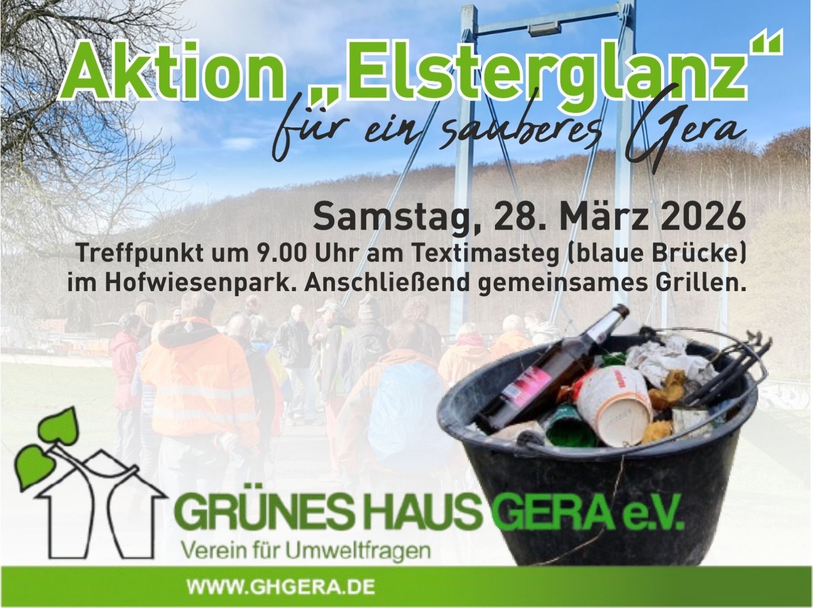 Der Umweltverein Grünes Haus Gera e. V. führt im Rahmen des Geraer Frühjahrsputzes am Sonnabend, 28. März 2026 wieder die Aktion "Elsterglanz" zur Beräumung der Fluss- und Uferbereiche der Weißen Elster im Raum Gera durch.