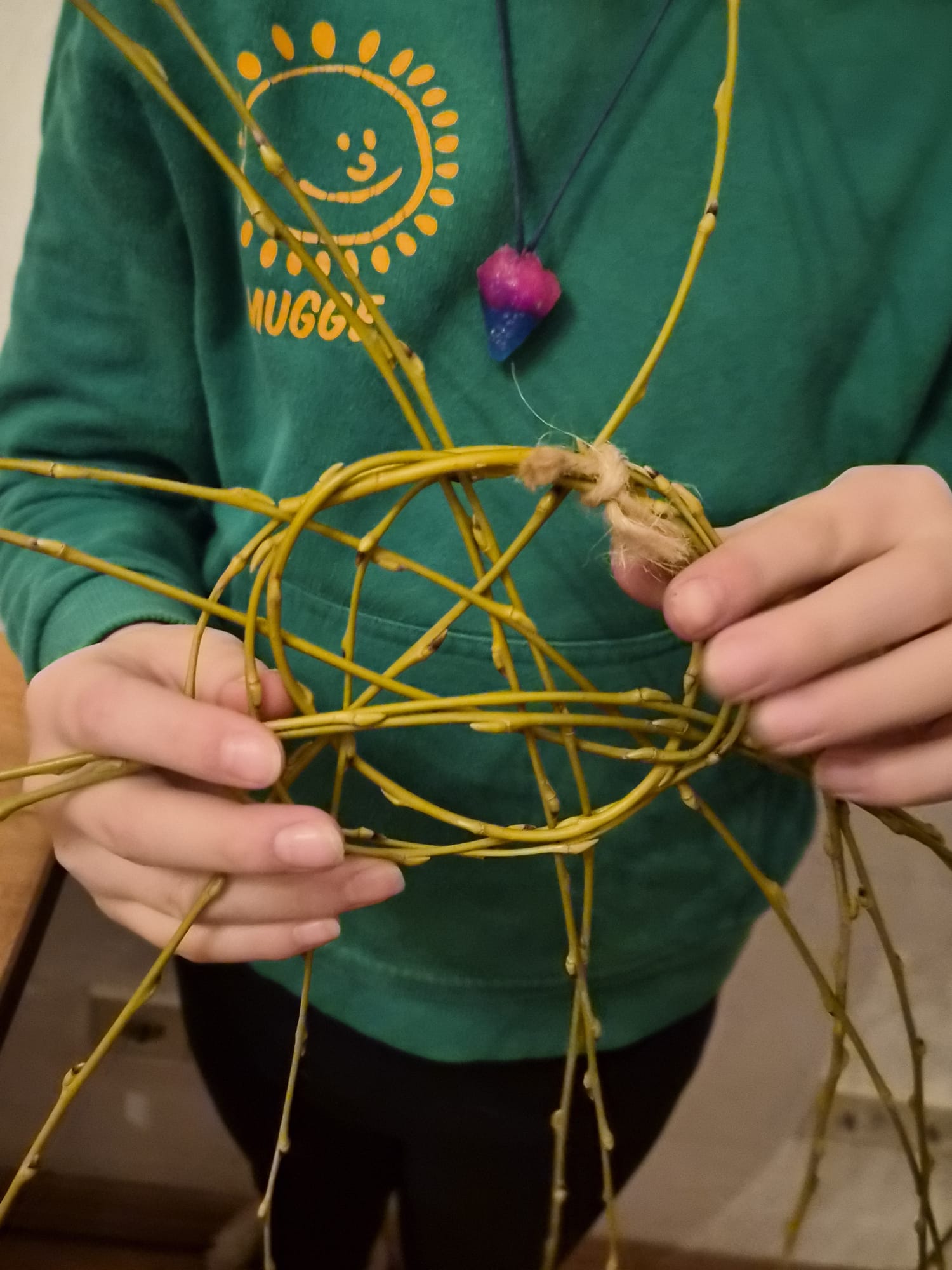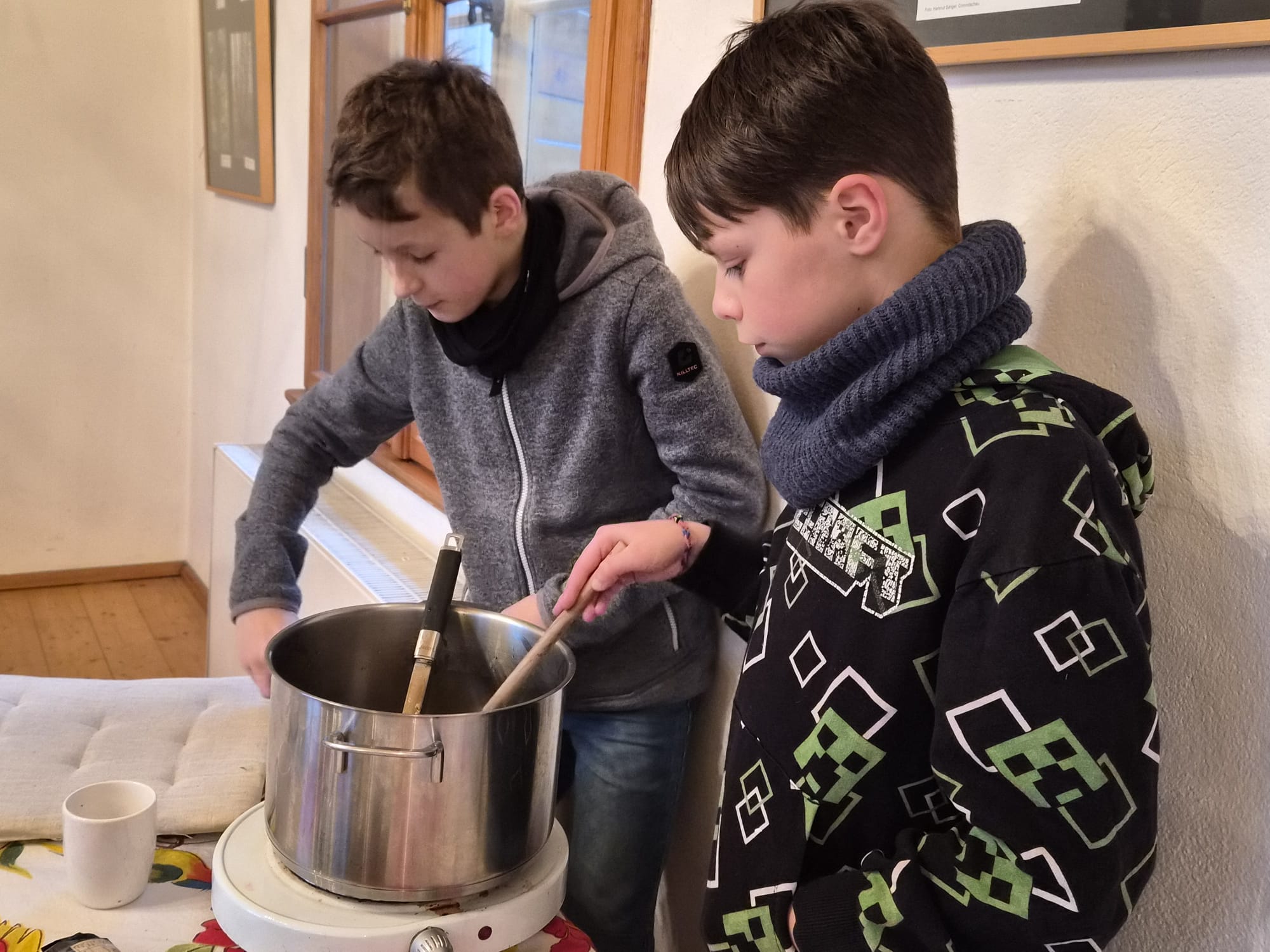 Während die einen Kids im Topf Pflanzenfett und alle Zutaten mixen, schneiden andere Kids Fäden für die unkomplizierte Aufhängung und knoten diese an die Tassen. Andere Kids finden im Botanischen Garten völlig happy den ersten kleinen Winterling.