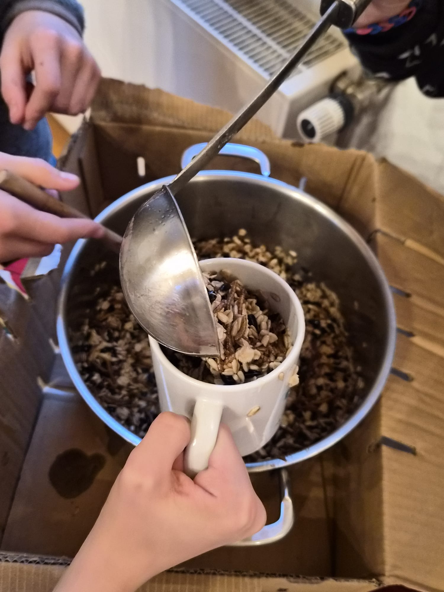 Im Botanischen Gartenhaus Gera wurden nun getrocknete Mehlwürmer ( schmecken gar nicht so übel) , Haferflocken und geschälte Sonnenblumenkerne von den Kids gemischt. Hinzu kommen noch schwarze Sonnenblumenkerne. BITTE keine gestreiften Sonnenblumenkerne verwenden: diese nehmen die Vögel zwar mit-können sie mit ihren Schnäbeln allerdings nicht öffnen.