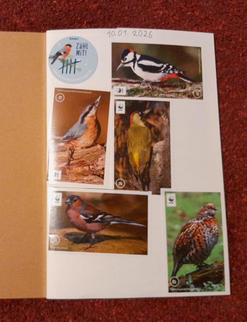 Zunächst aber wurden die neu eingeführten Naturtagebücher ausgefüllt und mit Aufklebern von Blaumeise und Trauerschnäpper versehen. Die Tagebücher sollen die Kinder an die gemeinsamen Treffen der Gruppe erinnern. Sie sind aber auch dafür gedacht, dass die Kinder zu Hause Einträge machen können, die sie den anderen Kindern der Gruppe beim nächsten Treffen zeigen können.