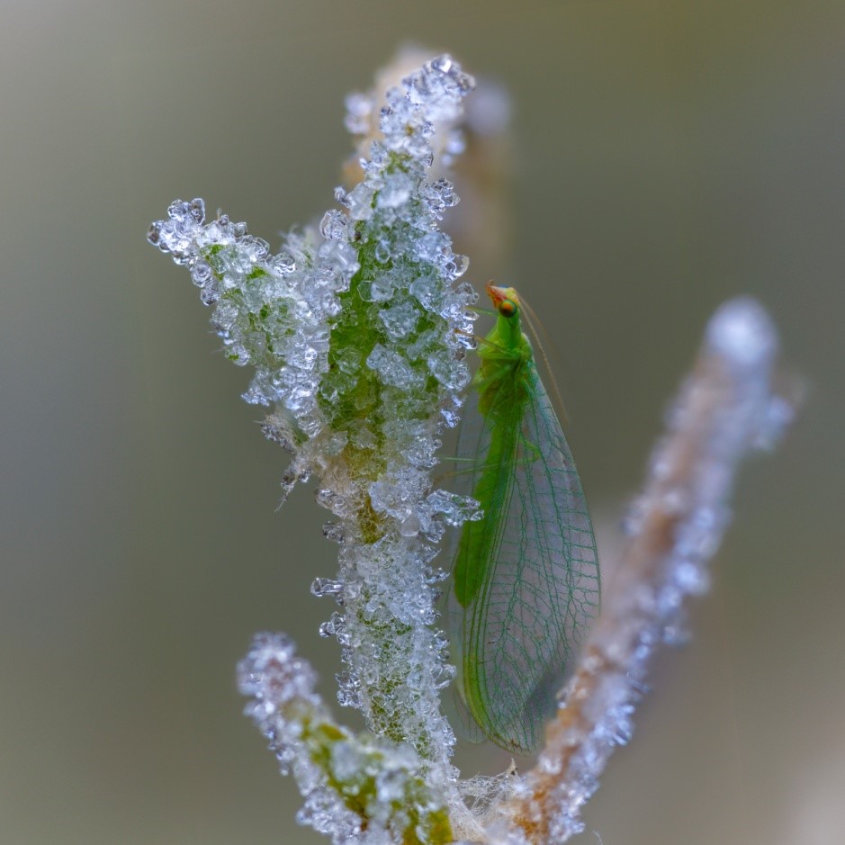 Die Florfliege (Chrysopa carnea) ist trotz ihres zarten Aussehens ein robuster Überlebenskünstler. Gern überdauert sie an geschützten Orten, doch überlebt sie Frost auch so, wie auf diesem Foto zu sehen ist. Gut getarnt, wird sie wohl nicht so leicht verspeist, unter anderem weil einige ihrer Fressfeinde Winterschlaf halten.